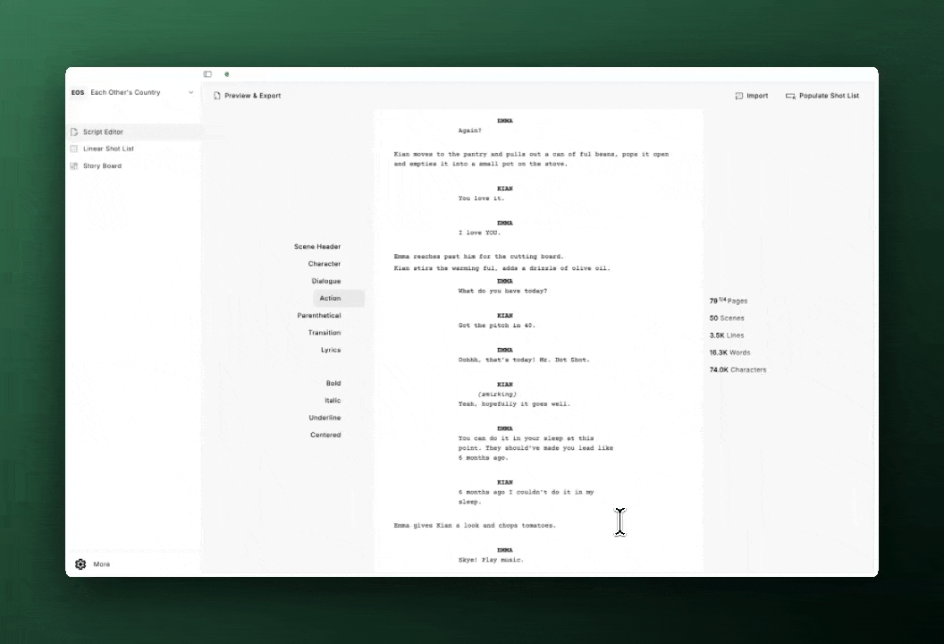 Upload or write scripts directly in Cinelog with Universal Fountain Format. Simple, intuitive, and connected to your workflow.
