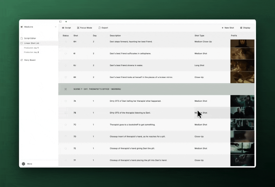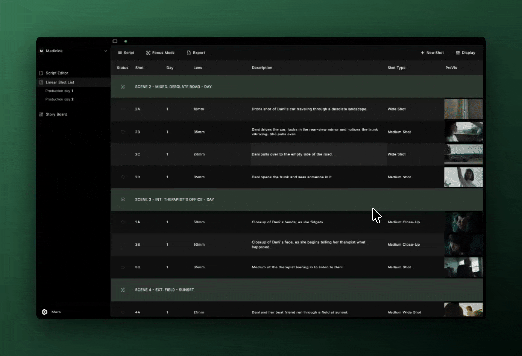 Visually map your project, track shot density, and spot gaps to keep the story and shoot flowing.