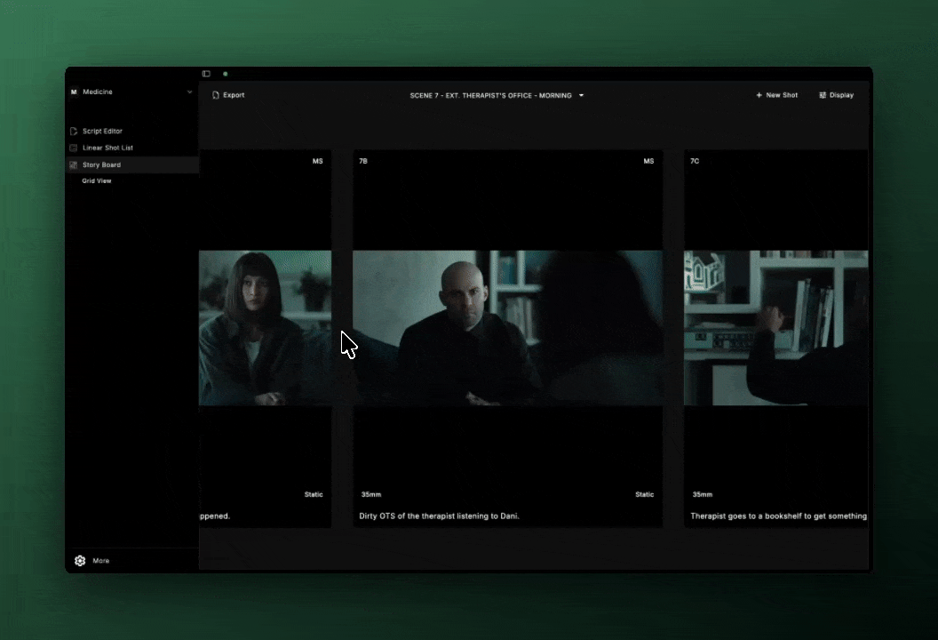 View your storyboards in linear mode to see your film’s progression. Or in grid view mode, to see the big picture.